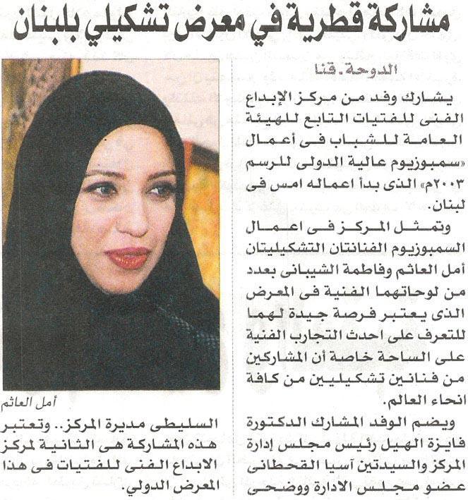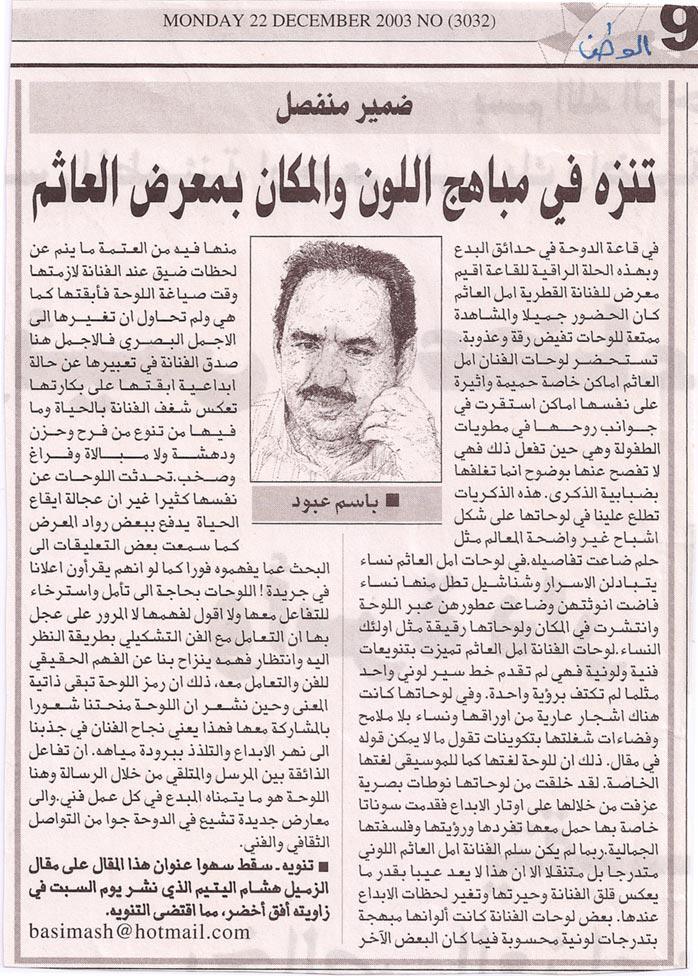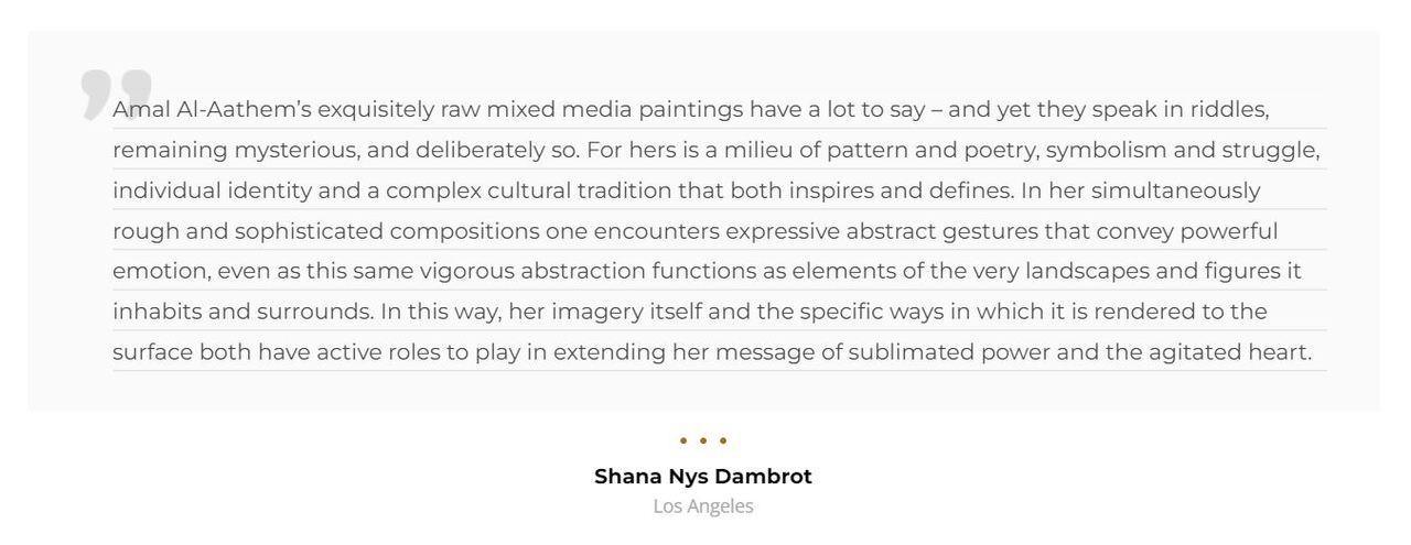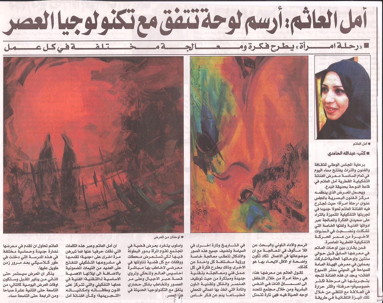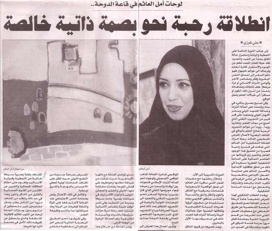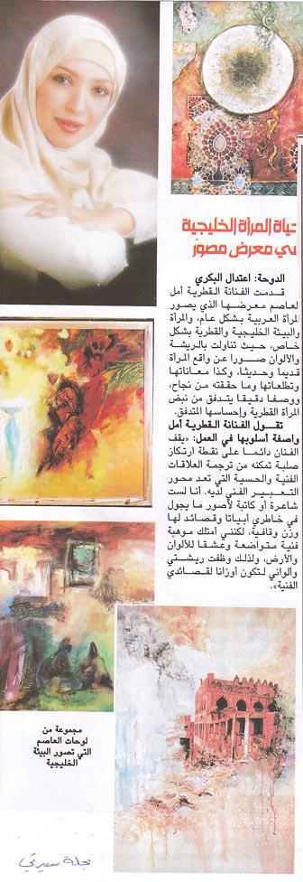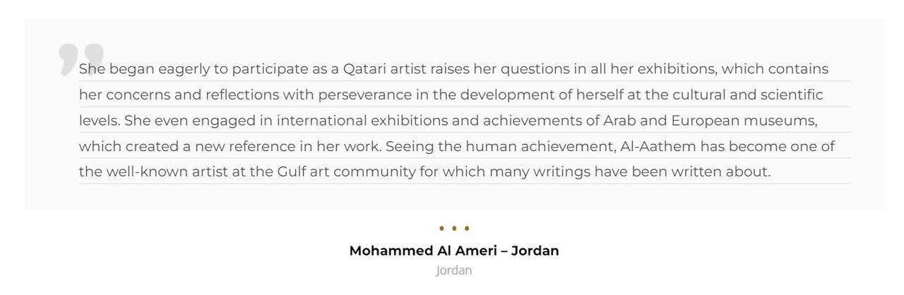 Amal Al Aathem is one of the most prominent and proactive Qatari artists today, her reputation as an artist with a real voice and message has won her respect internationally. Her work has been widely exhibited in the region and in different parts of the world.